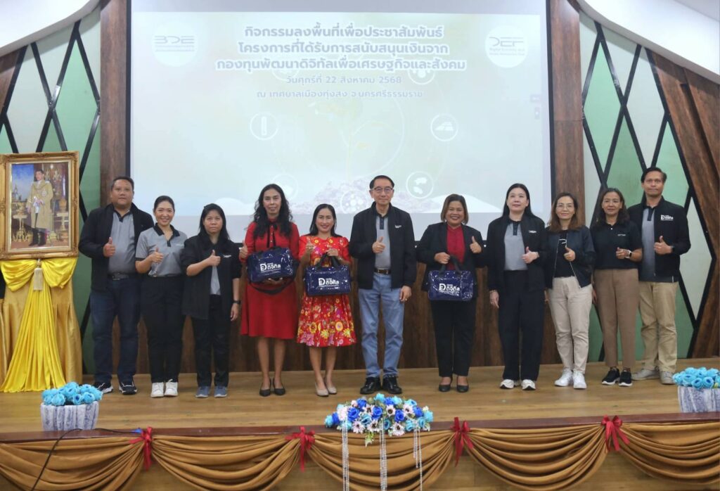 วันนี้ (22 ส.ค.68) สำนักงานคณะกรรมการดิจิทัลเพื่อเศรษฐกิจและสังคมแห่งชาติ (สดช.) โดยกองทุนพัฒนาดิจิทัลเพื่อเศรษฐกิจและสังคม นำโดยนายสมบูรณ์ เมฆไพบูลย์วัฒนา ผู้เชี่ยวชาญเฉพาะด้านการบริหารเทคโนโลยีดิจิทัลและการสื่อสาร พร้อมคณะผู้บริหารและเจ้าหน้าที่ สดช. ลงพื้นที่จังหวัดนครศรีธรรมราช เพื่อประชาสัมพันธ์ “โครงการนำร่องแปลงสาธิตเกษตรอัจฉริยะศูนย์ดิจิทัลชุมชน ของมหาวิทยาลัยเทคโนโลยีราชมงคลสุวรรณภูมิ” ที่ได้มีการจัดทำสมาร์ตฟาร์มต้นแบบในพื้นที่ของศูนย์ดิจิทัลชุมชนเทศบาลเมืองทุ่งสง ซึ่งเป็นโครงการที่ได้รับการสนับสนุนจากกองทุนพัฒนาดิจิทัลเพื่อเศรษฐกิจและสังคม (กองทุนดีอี) ประจำปีงบประมาณ 2565 ซึ่งปัจจุบันได้ดำเนินการแล้วเสร็จเป็นที่เรียบร้อยแล้ว การลงพื้นที่ในครั้งนี้ ได้รับเกียรติจาก นางมาริสา เพ็ชรทอง รองปลัดเทศบาล ปฎิบัติราชการแทนปลัดเทศบาล รักษาราชการแทนนายกเทศมนตรีเมืองทุ่งสง นางสมฤดี รัตนสุภา รองผู้อำนวยการ โรงเรียนรีสอร์ทอนุบาลทุ่งสง พร้อมทั้งเจ้าหน้าที่เทศบาลเมืองทุ่งสง และคณะครูโรงเรียนรีสอร์ทอนุบาลทุ่งสง ร่วมให้การต้อนรับ