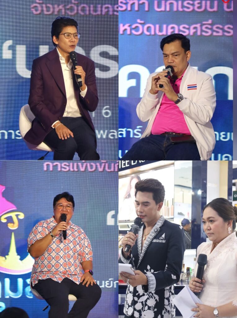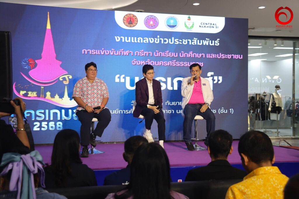 วันนี้ (6 ก.ย.68) ศูนย์การค้าเซนทรัลพลาซ่า นครศรีธรรมราช นายเอกชัย สุนทร ปลัดจังหวัดนครศรีธรรมราช พร้อมด้วยนางสาววาริน ชิณวงศ์ นายกองค์การบริหารส่วนจังหวัดนครศรีธรรมราช และนางสาวศรีจิตร เชมิยาทร ผู้ช่วยท่องเที่ยวและกีฬาจังหวัดนครศรีธรรมราช ร่วมแถลงข่าวการจัดการแข่งขันกีฬา กรีฑา นักเรียน นักศึกษาและประชาชน จังหวัดนครศรีธรรมราช “นครเกมส์” ประจำปี 2568 โอกาสนี้มีนายสุวัฒน์ จันทร์สุข รองผู้ว่าราชการจังหวัดนครศรีธรรมราช หัวหน้าส่วนราชการ ผู้แทนส่วนราชการ หน่วยงาน องค์กร สมาชิกสภาจังหวัดนครศรีธรรมราช และผู้บริหารท้องถิ่นท้องที่ ตลอดจนสื่อมวลชนเข้าร่วมรับฟังการแถลงข่าว