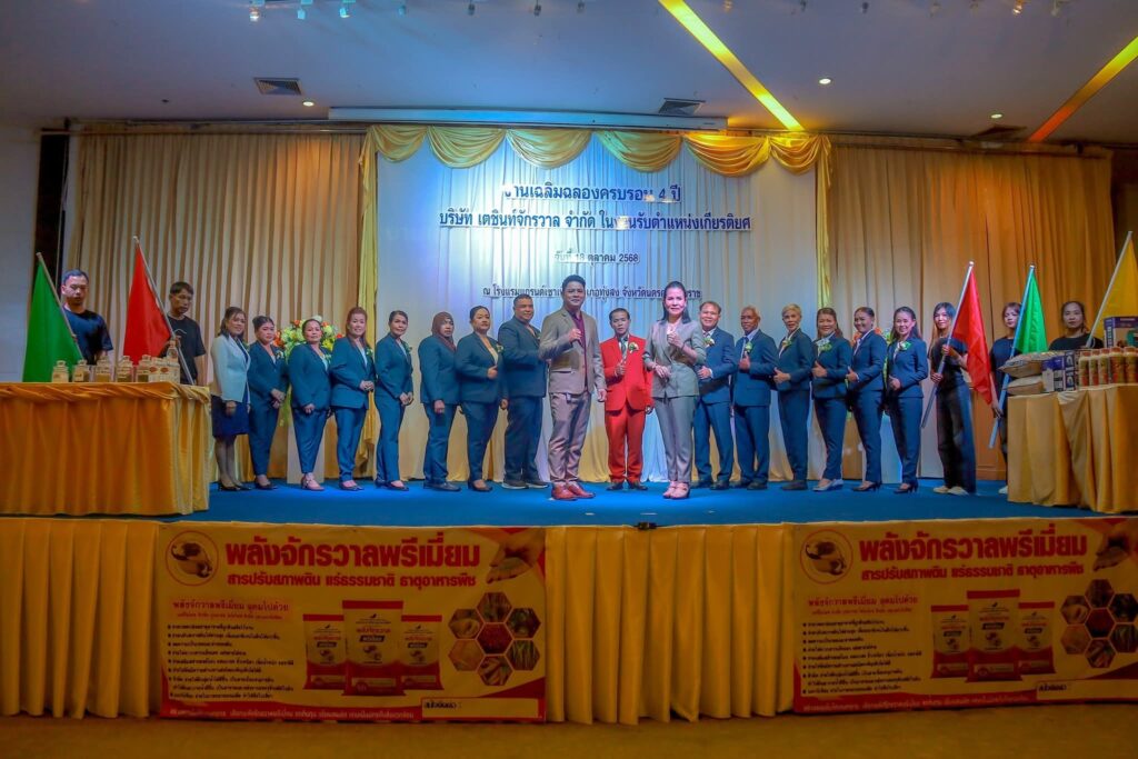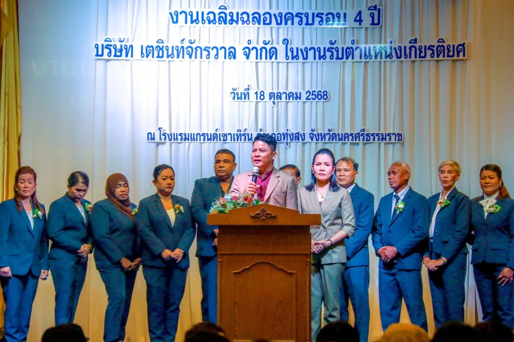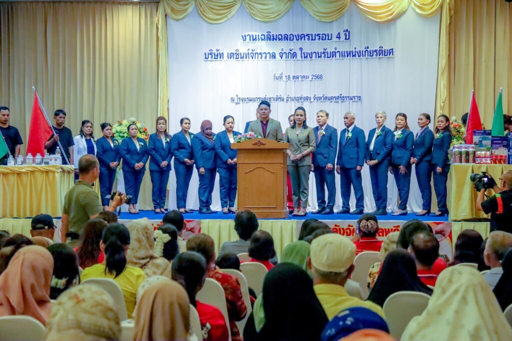 วันนี้ (18 ต.ค.68) บริษัท เตชินท์ จักรวาล จำกัด ผู้ผลิตและจำหน่ายผลิตภัณฑ์สารปรับสภาพดิน ผลิตภัณฑ์ทางการเกษตรคุณภาพ และ ผลิตภัณฑ์ดูแลสุขภาพ นำโดย นายอุทัย นวนจันทร์ (บอสเตชินท์) ประธานบริษัทฯ ได้จัดงานเฉลิมฉลองครบรอบ 4 ปี ของการดำเนินงานอย่างยิ่งใหญ่ ในงานรับตำแหน่งเกียรติยศ ภายใต้บรรยากาศอย่างอบอุ่น และเต็มไปด้วยความสำเร็จ ที่ห้องประชุมใหญ่ โรงแรมแกรนด์เซาร์เทิรน์ทุ่งสง อำเภอทุ่งสง จังหวัดนครศรีธรรมราช