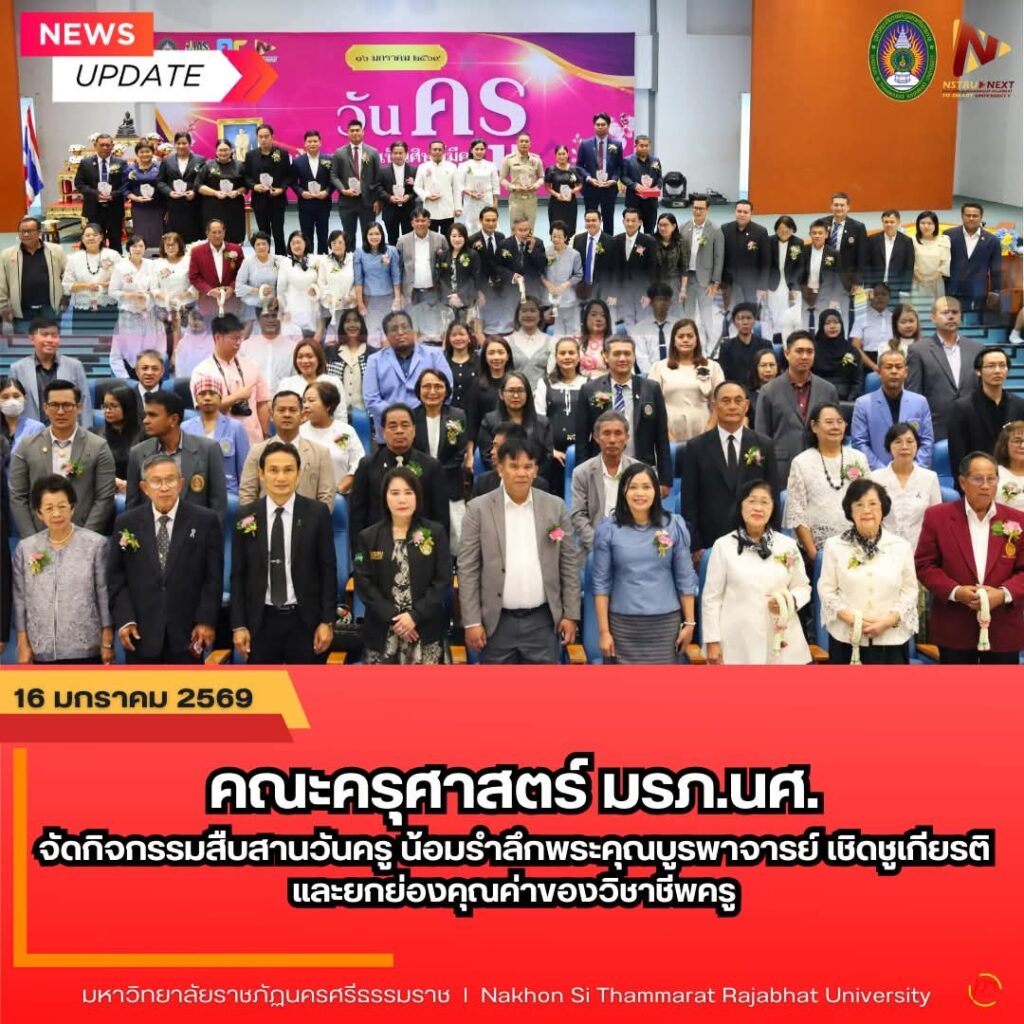 คณะครุศาสตร์ มหาวิทยาลัยราชภัฏนครศรีธรรมราช จัดกิจกรรมสืบสานวันครู ประจำปี 2569 ในวันที่ 16 มกราคม 2569 ณ หอประชุมภักดีดำรงฤทธิ์ มหาวิทยาลัยราชภัฏนครศรีธรรมราช โดยได้รับเกียรติจาก ผู้ช่วยศาสตราจารย์ ดร.วิชิต สุขทร รองอธิการบดี ฝ่ายวิชาการ กิจการนักศึกษา และงานบุคคล เป็นประธานในพิธี