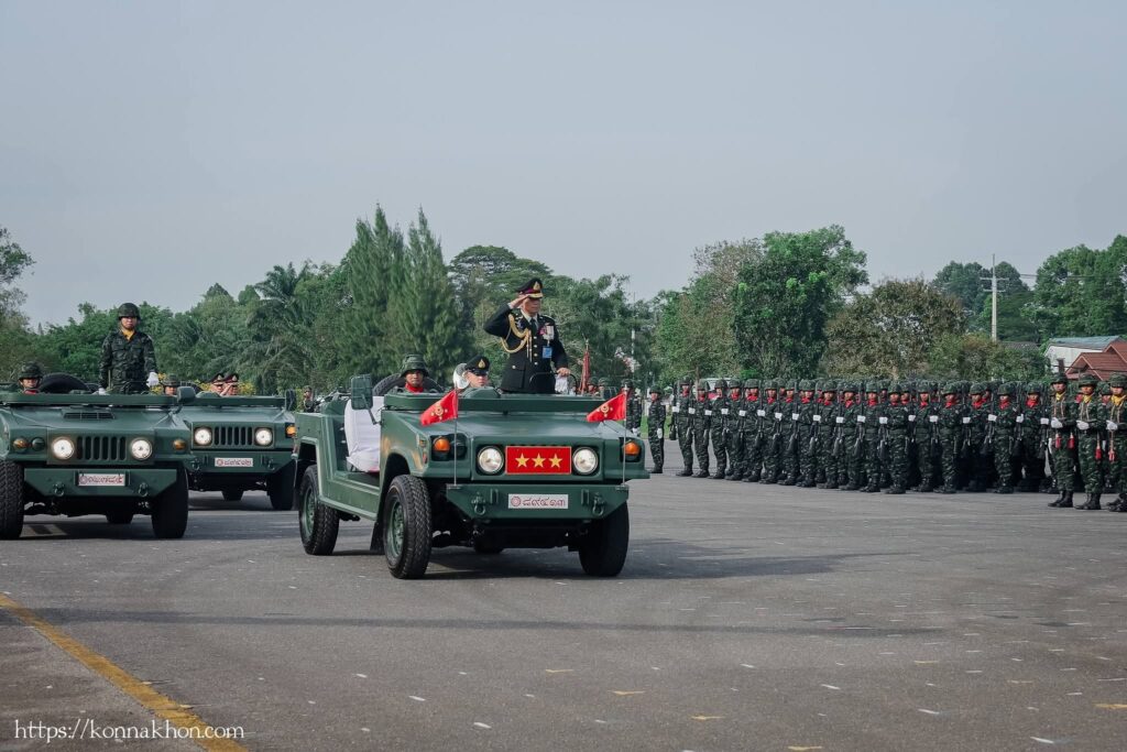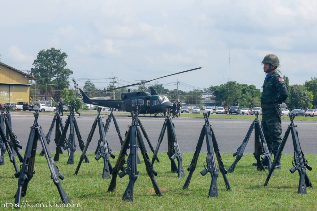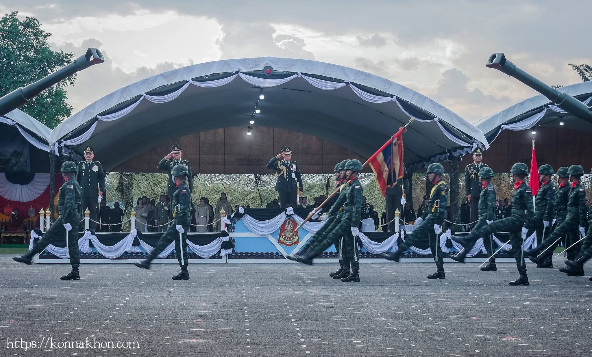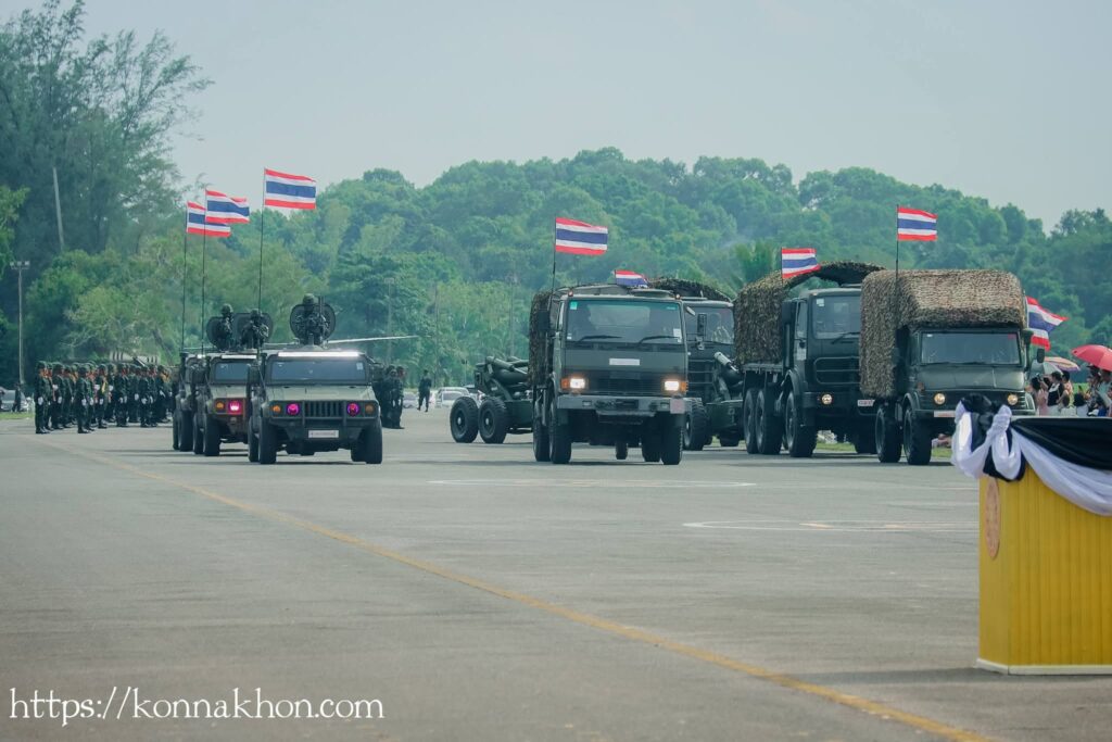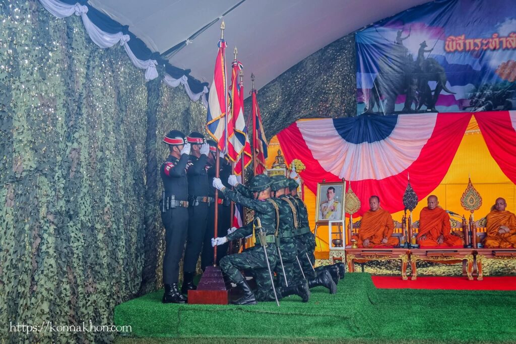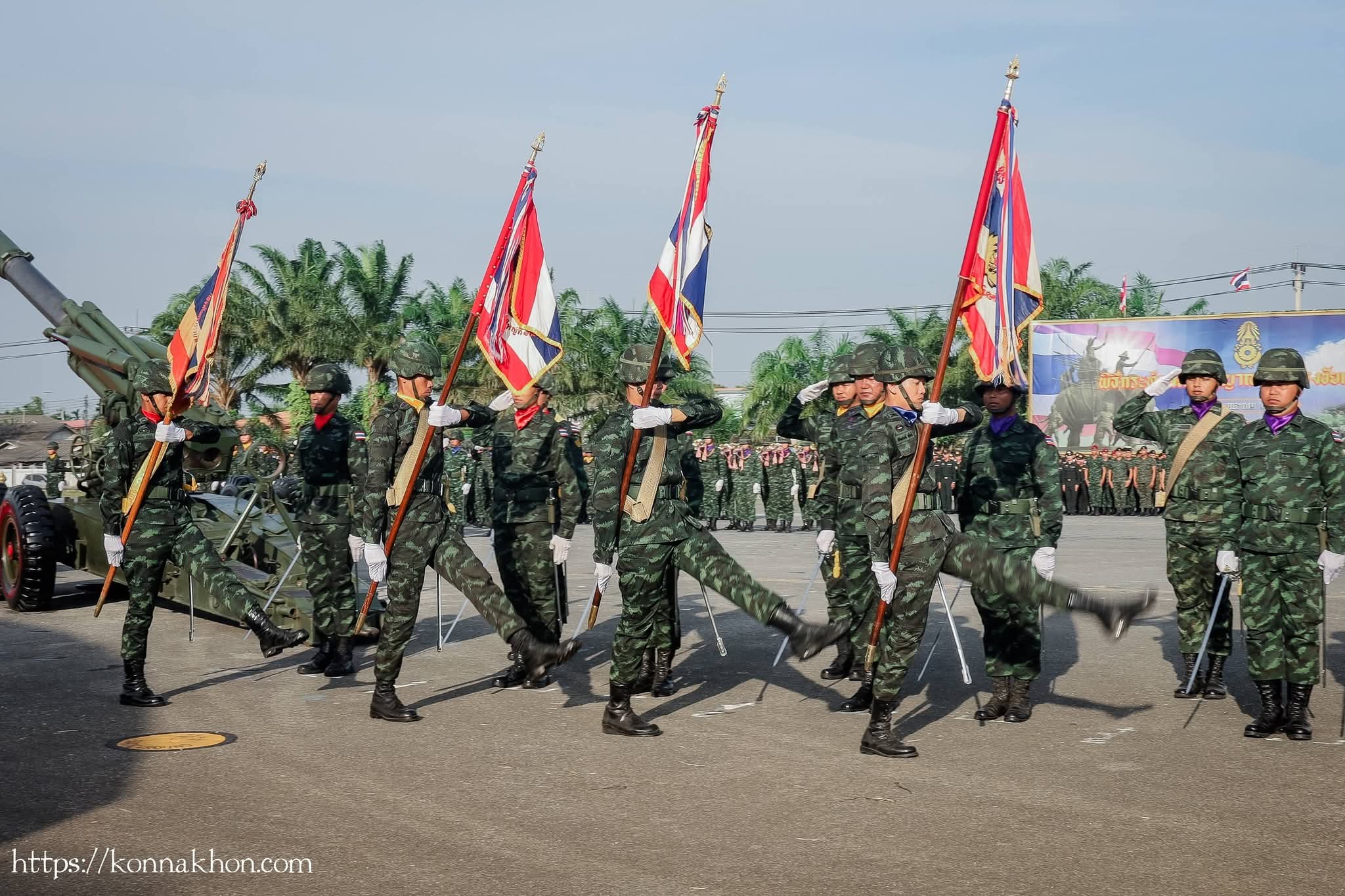 จากนั้น เวลา 16.00 น. เป็นพิธีกระทำสัตย์ปฏิญาณตนต่อธงชัยเฉลิมพล โดยพลโท นรธิป โพยนอก แม่ทัพภาคที่ 4 ได้ตรวจพลสวนสนาม พร้อมทั้งนำกล่าวปฏิญาณตนในพิธีกระทำสัตย์ปฏิญาณตนต่อธงชัยเฉลิมพล และการสวนสนามของหน่วยทหาร นำโดย พันเอก เกียรติศักดิ์ ณีวงศ์ ผู้บังคับการกรมทหารปืนใหญ่ที่ 5 เป็นผู้บังคับกองผสม จัดกองพันสวนสนาม จำนวน 4 กองพัน ประกอบด้วย กองพันสวนสนามที่ 1 จาก กองพันทหารราบที่ 2 กรมทหารราบที่ 15 ,กองพันสวนสนามที่ 2 จาก กองพันทหารปืนใหญ่ที่ 105 กรมทหารปืนใหญ่ที่ 5 ,กองพันสวนสนามที่ 3 จาก กองพันทหารสื่อสารที่ 24 กองทัพภาคที่ 4 และกองพันสวนสนามที่ 4 จาก มณฑลทหารบกที่ 41