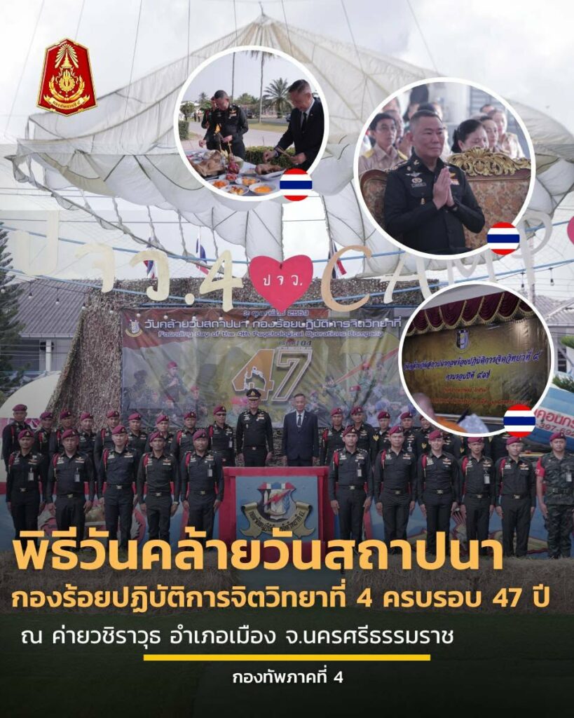 วันที่ 2 กุมภาพันธ์ 2569 เวลา 09.00 น. ณ กองร้อยปฏิบัติการจิตวิทยาที่ 4 ค่ายวชิราวุธ อำเภอเมือง จังหวัดนครศรีธรรมราช พลโท อนุสรณ์ โออุไร แม่ทัพน้อยที่ 4 ให้เกียรติเป็นประธานในพิธีวันคล้ายวันสถาปนา กองร้อยปฏิบัติการจิตวิทยาที่ 4 ครบรอบปีที่ 47 โดยมีคณะผู้บังคับบัญชา กำลังพล และประชาชนในพื้นที่เข้าร่วมพิธีอย่างพร้อมเพรียง