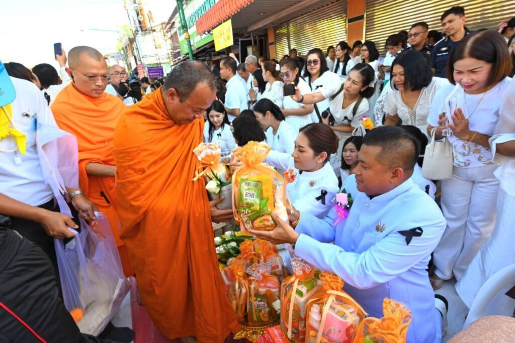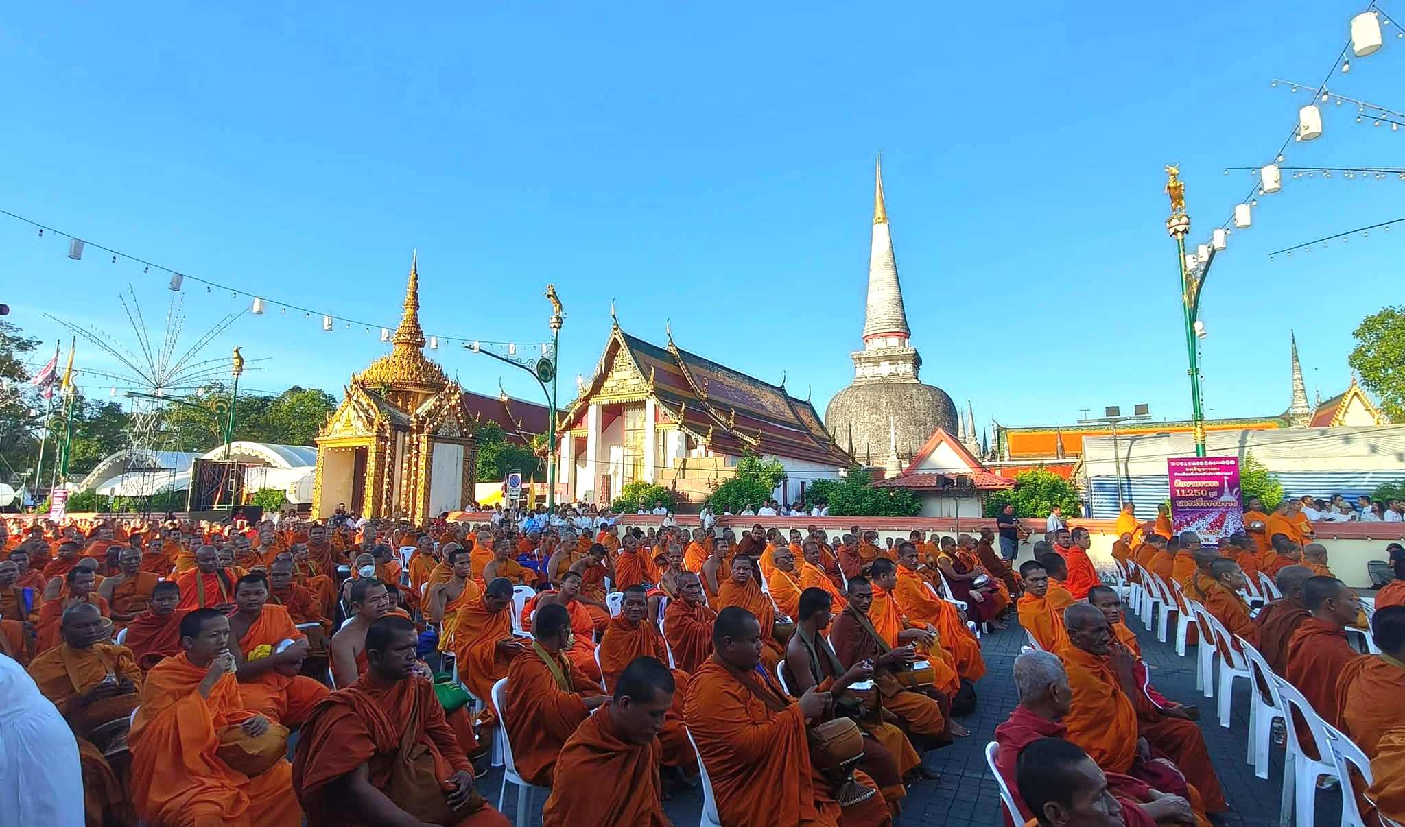 วันนี้ (28 ก.พ.69) เวลา 06.00 น. ณ วัดพระมหาธาตุ วรมหาวิหาร จังหวัดนครศรีธรรมราช นายสมชาย ลีหล้าน้อย ผู้ว่าราชการจังหวัดนครศรีธรรมราช เป็นประธานฆราวาส พระเทพสิริวชิรเวที เจ้าคณะภาค 16 (ธ) วัดพระมหาธาตุ วรมหาวิหาร จังหวัดนครศรีธรรมราช เป็นประธานสงฆ์ ในพิธีตักบาตรมหากุศล 11,250 รูป เฉลิมฉลอง 1,250 ปี ศรีธรรมราชเจดีย์สู่มรดกโลก โดยมีนางสาววันษา ลีหล้าน้อย นายกเหล่ากาชาดจังหวัด นายวิทยา เขียวรอด รองผู้ว่าราชการจังหวัดนครศรีธรรมราช นางเพ็ญศรี เชาวลิตร รองนายกเหล่ากาชาดจังหวัด หัวหน้าส่วนราชการ ภาคประชาชน และภาคประชาสังคมได้พร้อมใจกันจัดพิธีบำเพ็ญกุศลอุทิศถวายเป็นพระราชกุศลแด่พระบาทสมเด็จพระบรมชนกาธิเบศร มหาภูมิพลอดุลยเดชมหาราช บรมนาถบพิตร และสมเด็จพระนางเจ้าสิริกิติ์ พระบรมราชินีนาถ พระบรมราชชนนีพันปีหลวง จากนั้นพระภิกษุสงฆ์จาก 14 จังหวัดภาคใต้แปรแถวรรับบิณฑบาตตลอดแนวถนนราชดำเนิน ต่อเนื่องไปจนถึงแยกหอนาฬิกา