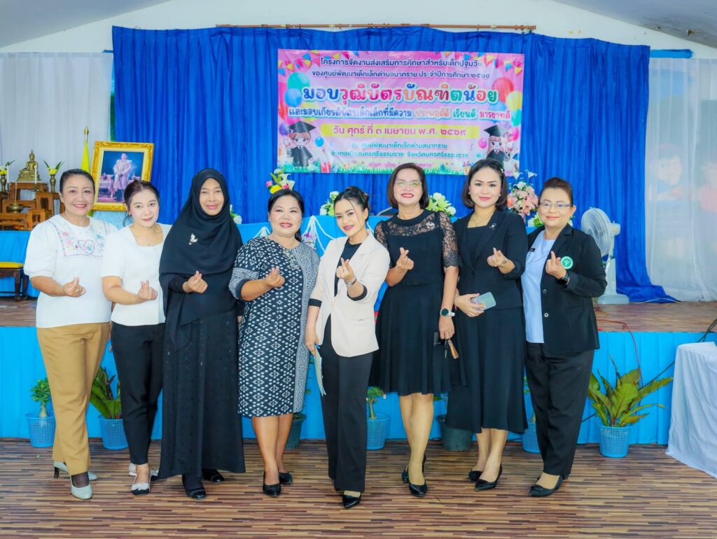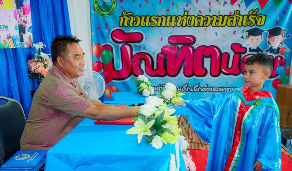 วันนี้ (3 เม.ย.69) เวลา 9.30 น. ณ ศูนย์พัฒนาเด็กเล็กตำบลนาทราย อำเภอเมือง จังหวัดนครศรีธรรมราช องค์การบริหารส่วนตำบลนาทราย ได้จัดโครงการส่งเสริมการศึกษาสำหรับเด็กปฐมวัย ประจำปีการศึกษา 2569 โดยมี ร้อยตำรวจตรีโกศล พูลพิพัฒน์ นายกองค์การบริหารส่วนตำบลนาทราย เป็นประธานในพิธีมอบวุฒิบัตรให้แก่ “บัณฑิตน้อย” ผู้สำเร็จการศึกษาในระดับปฐมวัย ​บรรยากาศภายในงานเป็นไปอย่างคึกคักและเต็มไปด้วยรอยยิ้ม โดยมี นายชัยเอื้อชัช สิริกาญจน์ ผู้อำนวยการโรงเรียนวัดหญ้า นางสาววิตรี จันพลโท ครูรักษาการในตำแหน่งผู้อำนวยการศูนย์พัฒนาเด็กเล็กตำบลนาทราย พร้อมด้วยคณะบริหารสถานศึกษาและคณะครู รวมถึงคณะผู้บริหารองค์การบริหารส่วนตำบลนาทราย แขกผู้มีเกียรติ และผู้ปกครอง เข้าร่วมแสดงความยินดีกับบุตรหลานอย่างคับคั่ง