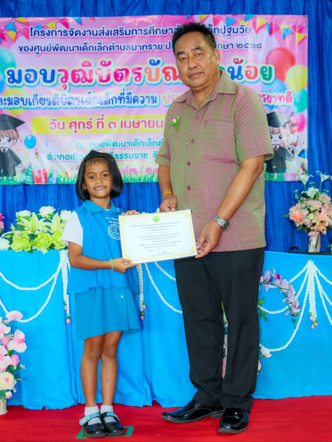 นอกจากการมอบวุฒิบัตรให้แก่เด็กที่สำเร็จการศึกษาแล้ว นายกองค์การบริหารส่วนตำบลนาทราย ยังได้ให้เกียรติมอบ เกียรติบัตรสำหรับเด็กเล็กที่มีความประพฤติดี เรียนดี และมีมารยาทดี เพื่อเป็นการยกย่องชมเชยและสร้างแรงจูงใจให้แก่เด็กๆ ในการรักษาคุณงามความดีและตั้งใจศึกษาเล่าเรียนต่อไป​ร้อยตำรวจตรีโกศล พูลพิพัฒน์ กล่าวว่า การจัดงานในครั้งนี้มีวัตถุประสงค์หลักเพื่อส่งเสริมให้เด็กปฐมวัยเกิดความภาคภูมิใจในความสำเร็จก้าวแรกของชีวิต และเป็นการกระตุ้นให้เด็กๆ มีทัศนคติที่ดีต่อการเรียน พร้อมที่จะพัฒนาศักยภาพของตนเองเพื่อเติบโตเป็นเยาวชนที่มีคุณภาพของตำบลนาทรายและของชาติต่อไป​ทั้งนี้ ศูนย์พัฒนาเด็กเล็กตำบลนาทราย มุ่งเน้นการจัดการเรียนการสอนที่เสริมสร้างพัฒนาการรอบด้าน ทั้งด้านร่างกาย จิตใจ อารมณ์ สังคม และสติปัญญา โดยความร่วมมืออย่างใกล้ชิดระหว่างสถานศึกษา ท้องถิ่น และผู้ปกครอง เพื่อวางรากฐานการศึกษาที่เข้มแข็งให้กับเด็กเยาวชนในพื้นที่อย่างยั่งยืน