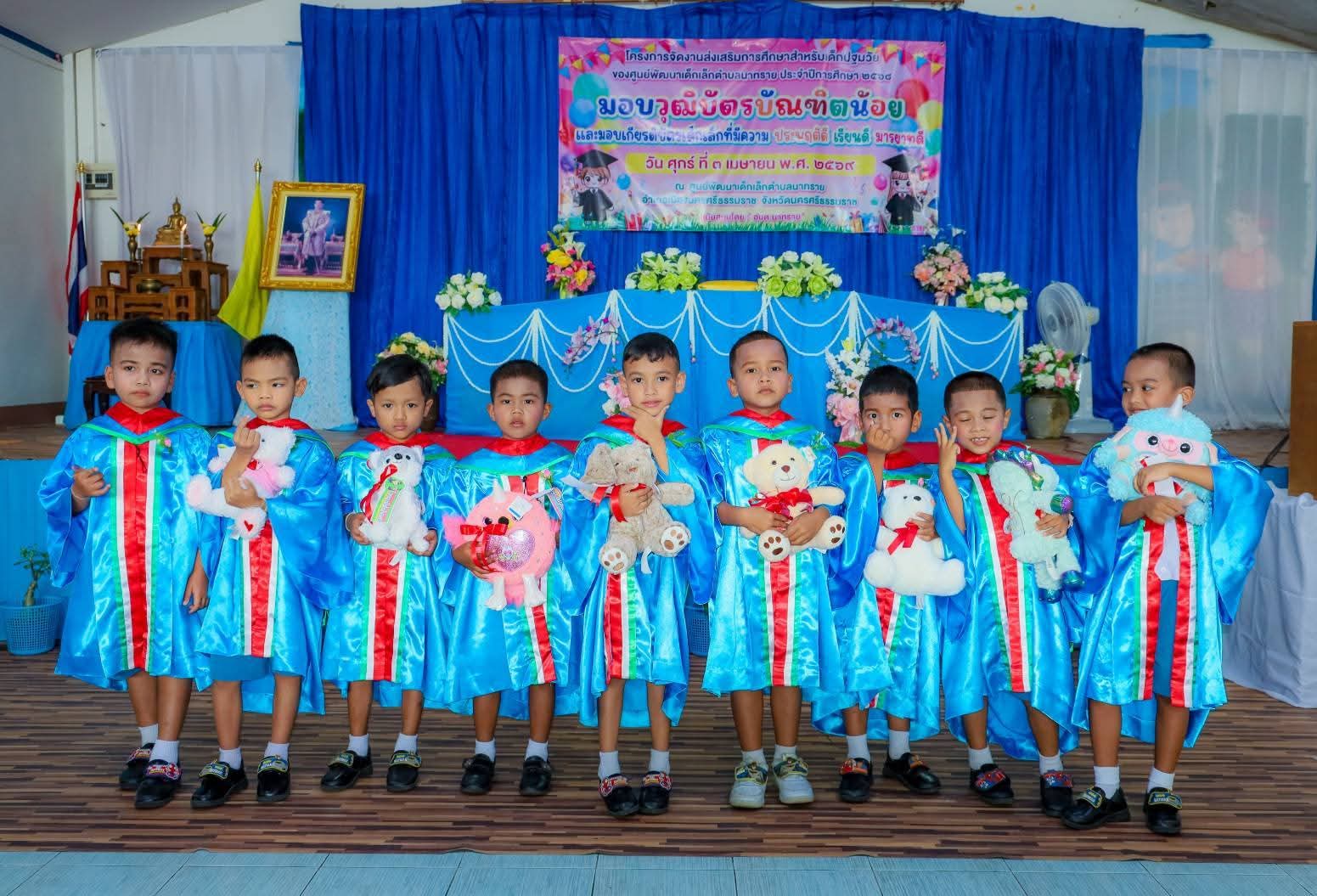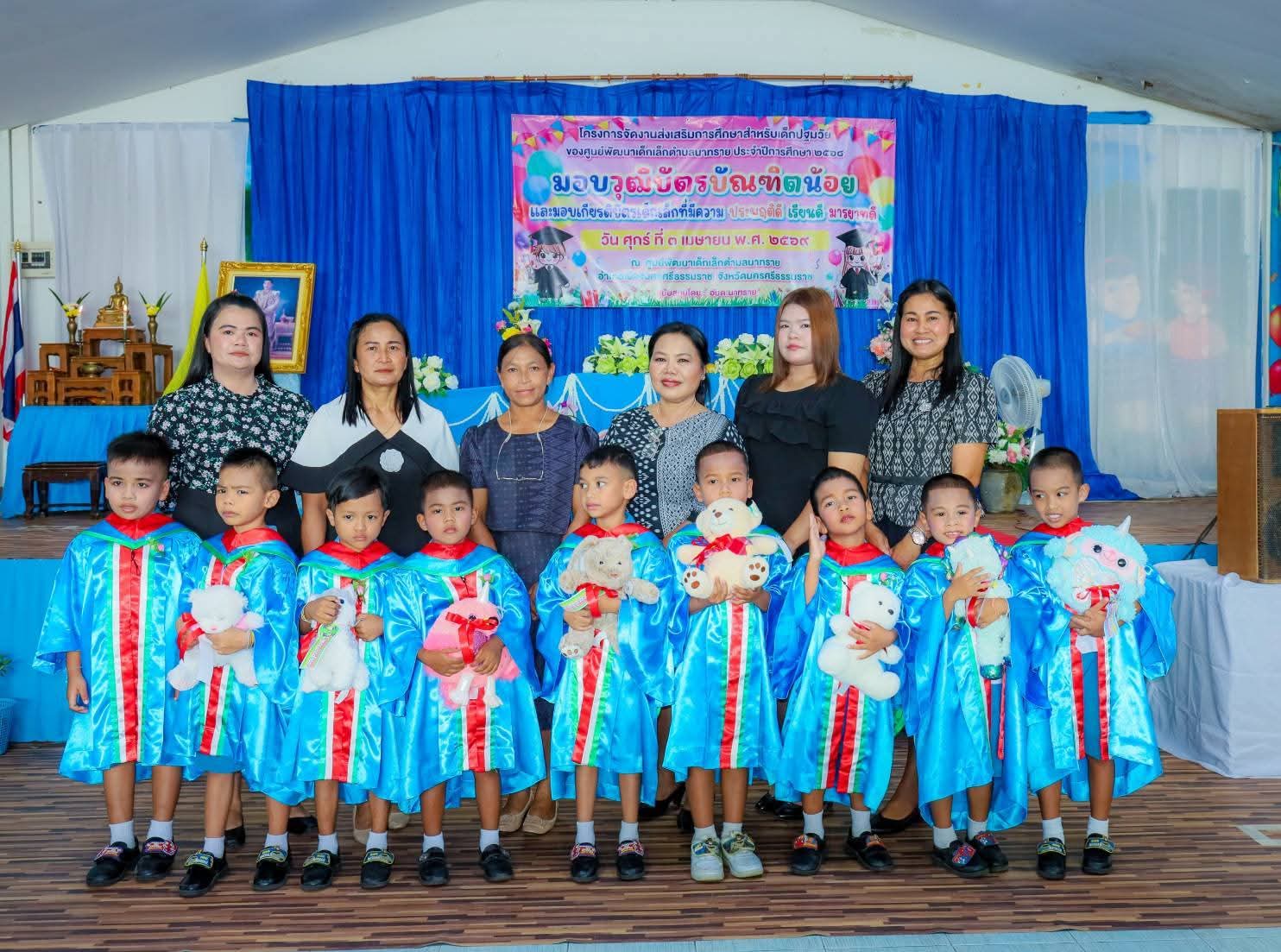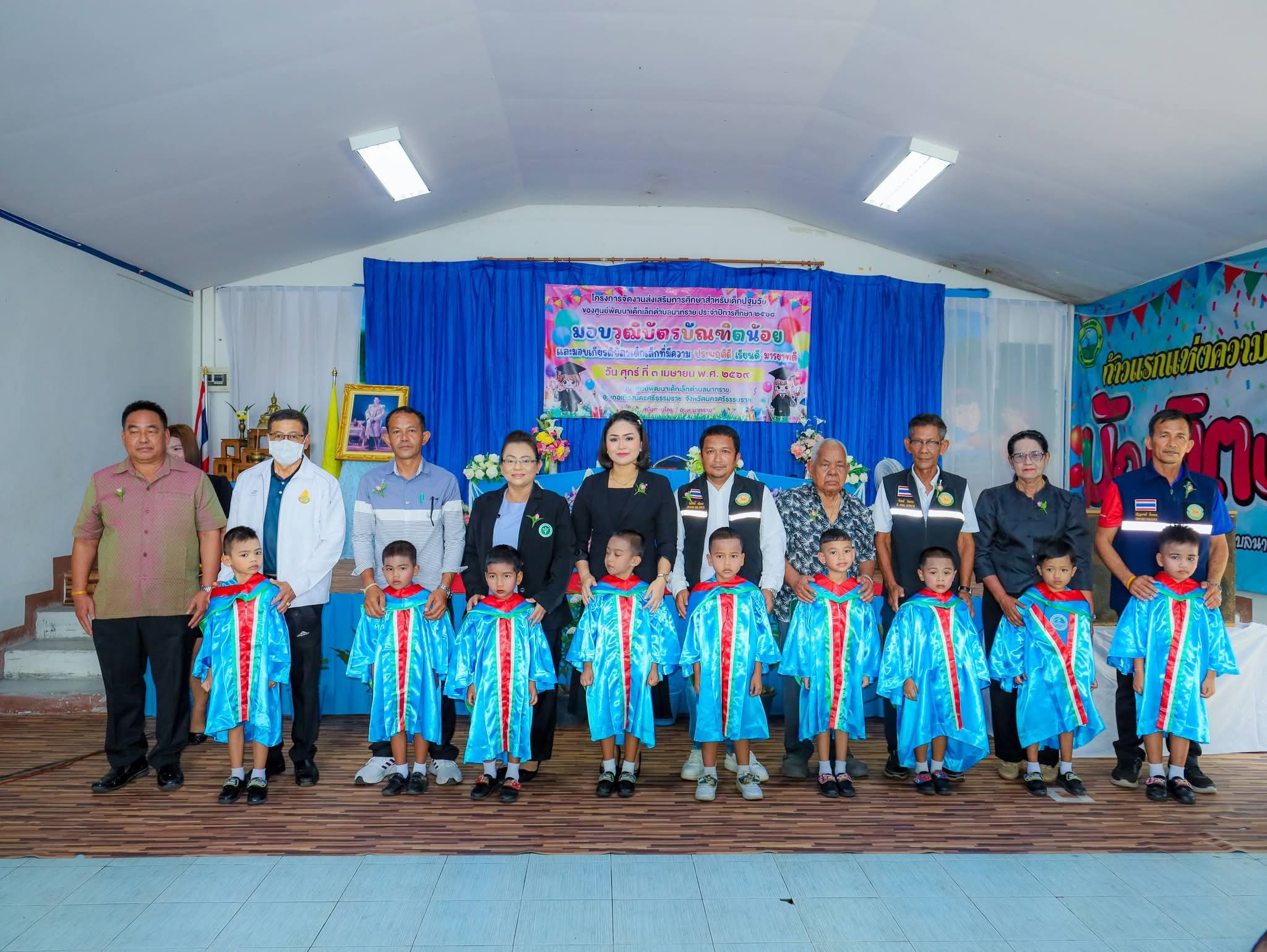 วันนี้ (3 เม.ย.69) เวลา 9.30 น. ณ ศูนย์พัฒนาเด็กเล็กตำบลนาทราย อำเภอเมือง จังหวัดนครศรีธรรมราช องค์การบริหารส่วนตำบลนาทราย ได้จัดโครงการส่งเสริมการศึกษาสำหรับเด็กปฐมวัย ประจำปีการศึกษา 2569 โดยมี ร้อยตำรวจตรีโกศล พูลพิพัฒน์ นายกองค์การบริหารส่วนตำบลนาทราย เป็นประธานในพิธีมอบวุฒิบัตรให้แก่ “บัณฑิตน้อย” ผู้สำเร็จการศึกษาในระดับปฐมวัย ​บรรยากาศภายในงานเป็นไปอย่างคึกคักและเต็มไปด้วยรอยยิ้ม โดยมี นายชัยเอื้อชัช สิริกาญจน์ ผู้อำนวยการโรงเรียนวัดหญ้า นางสาววิตรี จันพลโท ครูรักษาการในตำแหน่งผู้อำนวยการศูนย์พัฒนาเด็กเล็กตำบลนาทราย พร้อมด้วยคณะบริหารสถานศึกษาและคณะครู รวมถึงคณะผู้บริหารองค์การบริหารส่วนตำบลนาทราย แขกผู้มีเกียรติ และผู้ปกครอง เข้าร่วมแสดงความยินดีกับบุตรหลานอย่างคับคั่ง