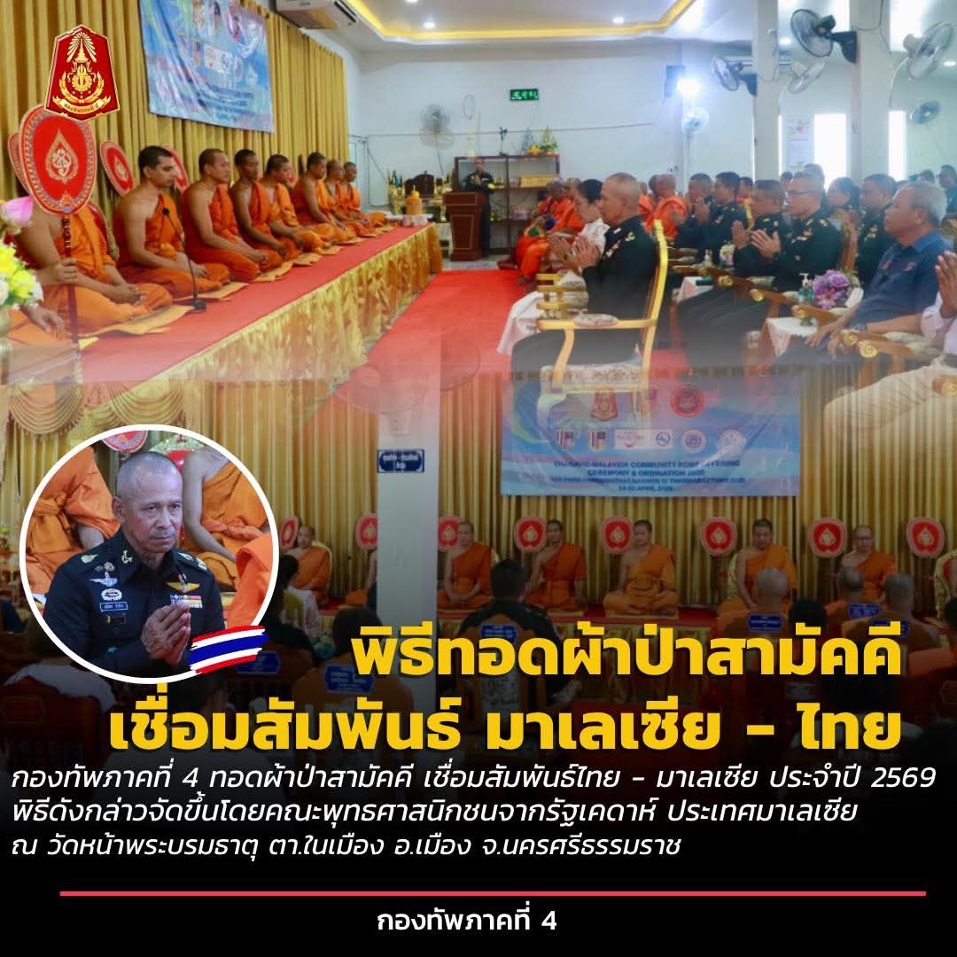 วันนี้ ( 25 เม.ย.69) เวลา 10.00 น. ณ วัดหน้าพระบรมธาตุ ตำบลในเมือง อำเภอเมือง จังหวัดนครศรีธรรมราช พลตรี เฉลิมพร ขำเขียว รองแม่ทัพภาคที่ 4 เป็นผู้แทน แม่ทัพภาคที่ 4 เป็นประธานในพิธีทอดผ้าป่าสามัคคี เชื่อมสัมพันธ์ไทย – มาเลเซีย ประจำปี 2569 พิธีดังกล่าวจัดขึ้นโดยคณะพุทธศาสนิกชนจากรัฐเคดาห์ ประเทศมาเลเซีย ร่วมกับวัดบุญญาราม เพื่อเป็นการส่งเสริมและเชื่อมความสัมพันธ์อันดีระหว่างประชาชนของทั้งสองประเทศ ผ่านกิจกรรมทางพระพุทธศาสนา